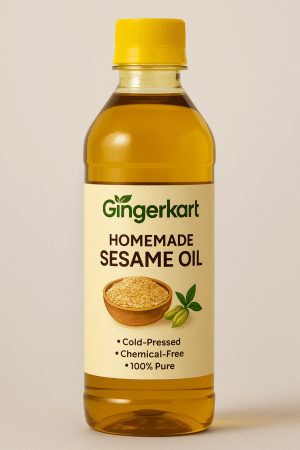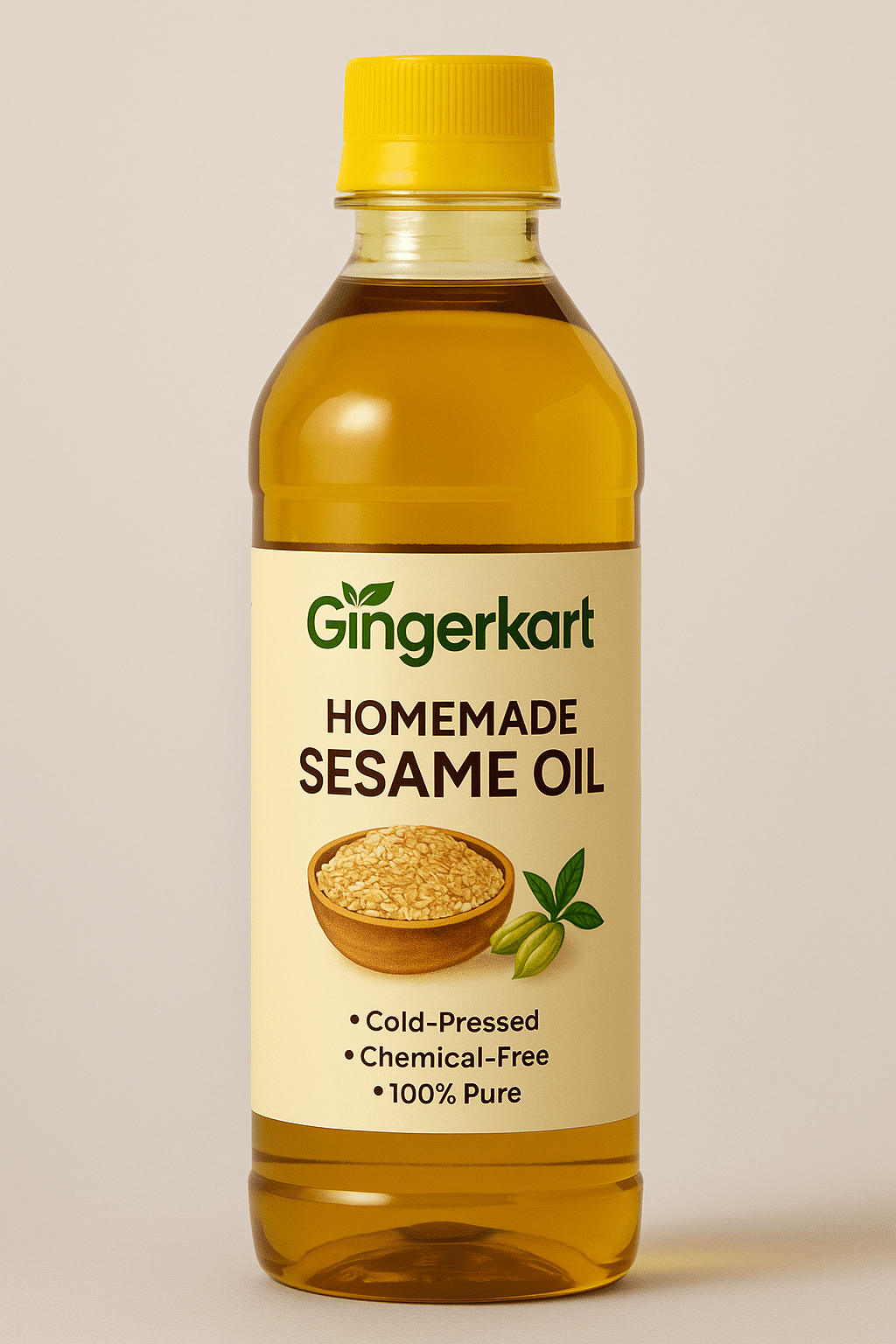 Experience the authentic taste and goodness of GingerKart Homemade Sesame Oil, traditionally extracted using the cold-press method to preserve its nutrients, flavor, and natural aroma. Unlike refined oils, our sesame oil is 100% pure, chemical-free, and preservative-free, ensuring every drop is packed with wholesome nutrition.